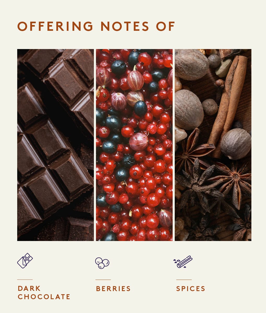 In the cup, expect a rich and comforting profile with notes of dark chocolate, berries and warming spices.